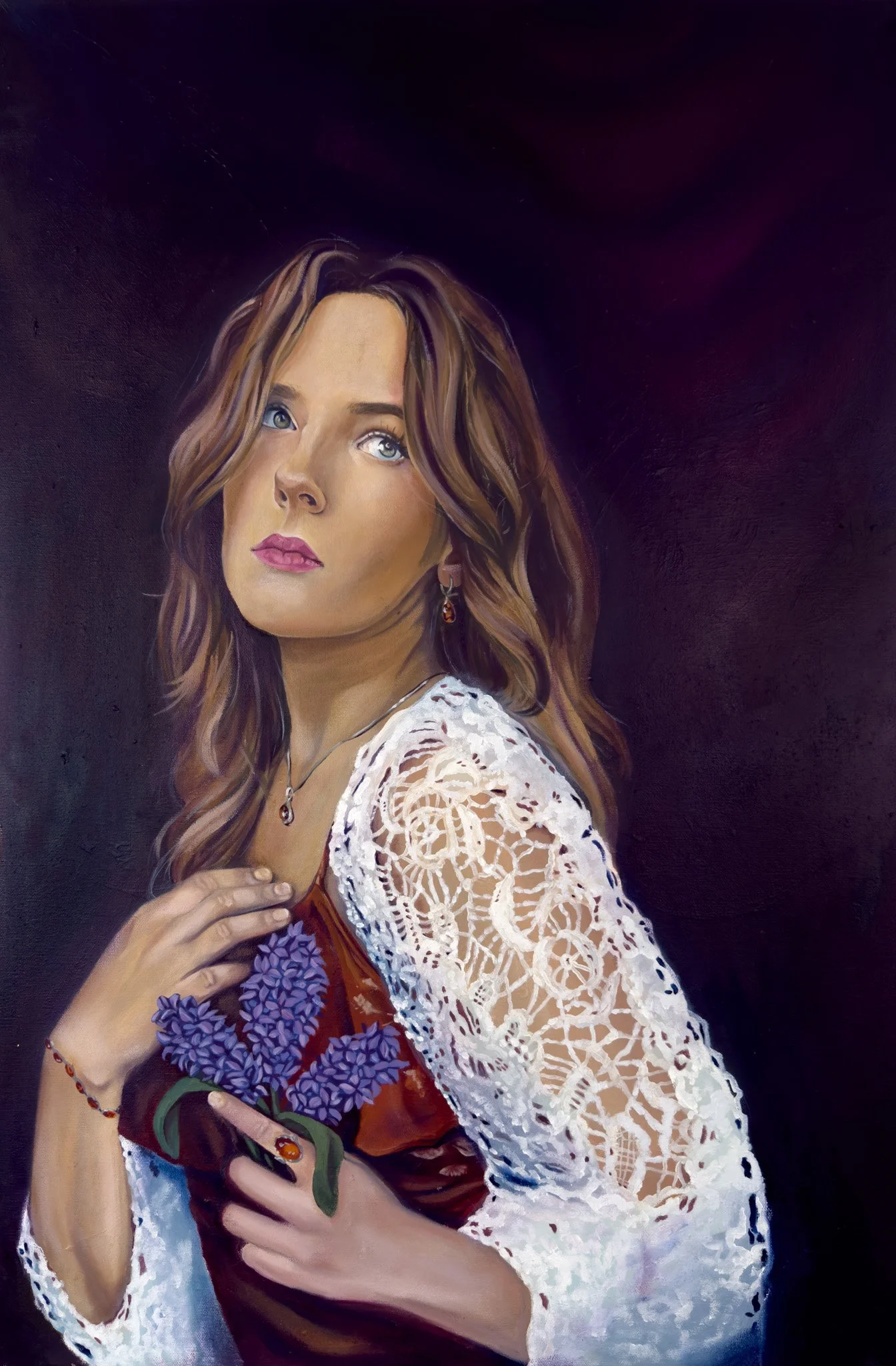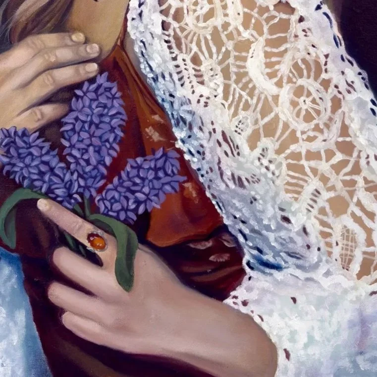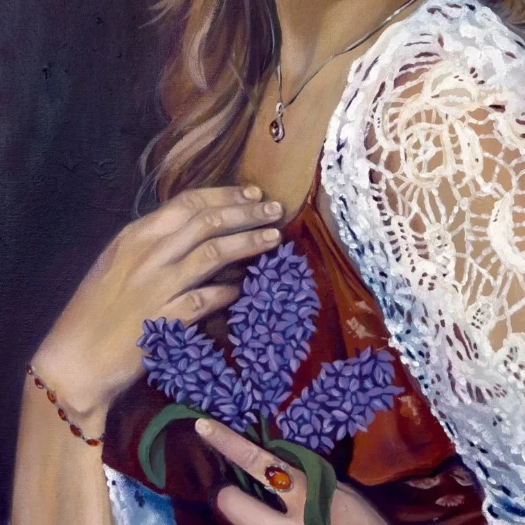 I am depicted wearing my signature color and amber jewelry, elements that carry personal and symbolic meaning. In many cultures, amber is believed to offer protection. While this belief may not be grounded in certainty, I wear it as a form of reassurance, an intimate gesture toward comfort and stability. The lavender I hold introduces a contrasting softness, symbolizing purity, devotion, calmness, and grace, qualities I strive to embody both now and in the future.